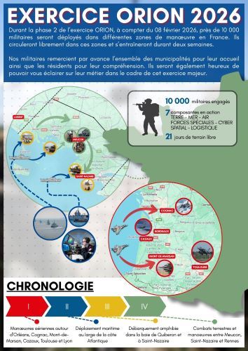 Durant la phase 2 de l’exercice interarmées et interalliés ORION 26, près de 10 000 militaires seront déployés dans toute la France et notamment dans le Morbihan. Merci de leur réserver votre meilleur accueil.